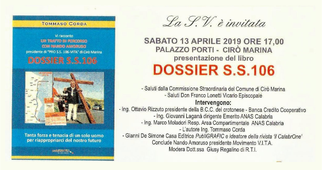 20 anni di impegno, tenacia, perseveranza e dedizione al mio territorio racchiusi nell’opera dello scrittore Ing. Tommaso Corda. Con sentimento di riconoscenza e gratitudine verso lo stesso scrittore, sono lieto di annunciare la presentazione del volume “DOSSIER S.S. 106” alla mia cittadinanza e all’intero comprensorio della fascia ionica interessata.
