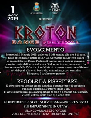 “Ringraziamo l’amministrazione Comunale e l’assessore alle Politiche Giovanili e Spettacolo Giuseppe Frisenda per la sensibilità dimostrata nell’accogliere presso la villa Comunale la nostra proposta finalizzata a coinvolgere tutta la comunità cittadina. Così come lo scorso anno, Kroton Dance Festival vuole essere una festa di popolo che unisce il primo maggio tutte le generazioni” dichiara Tony Ruggiero della The Twins Agency