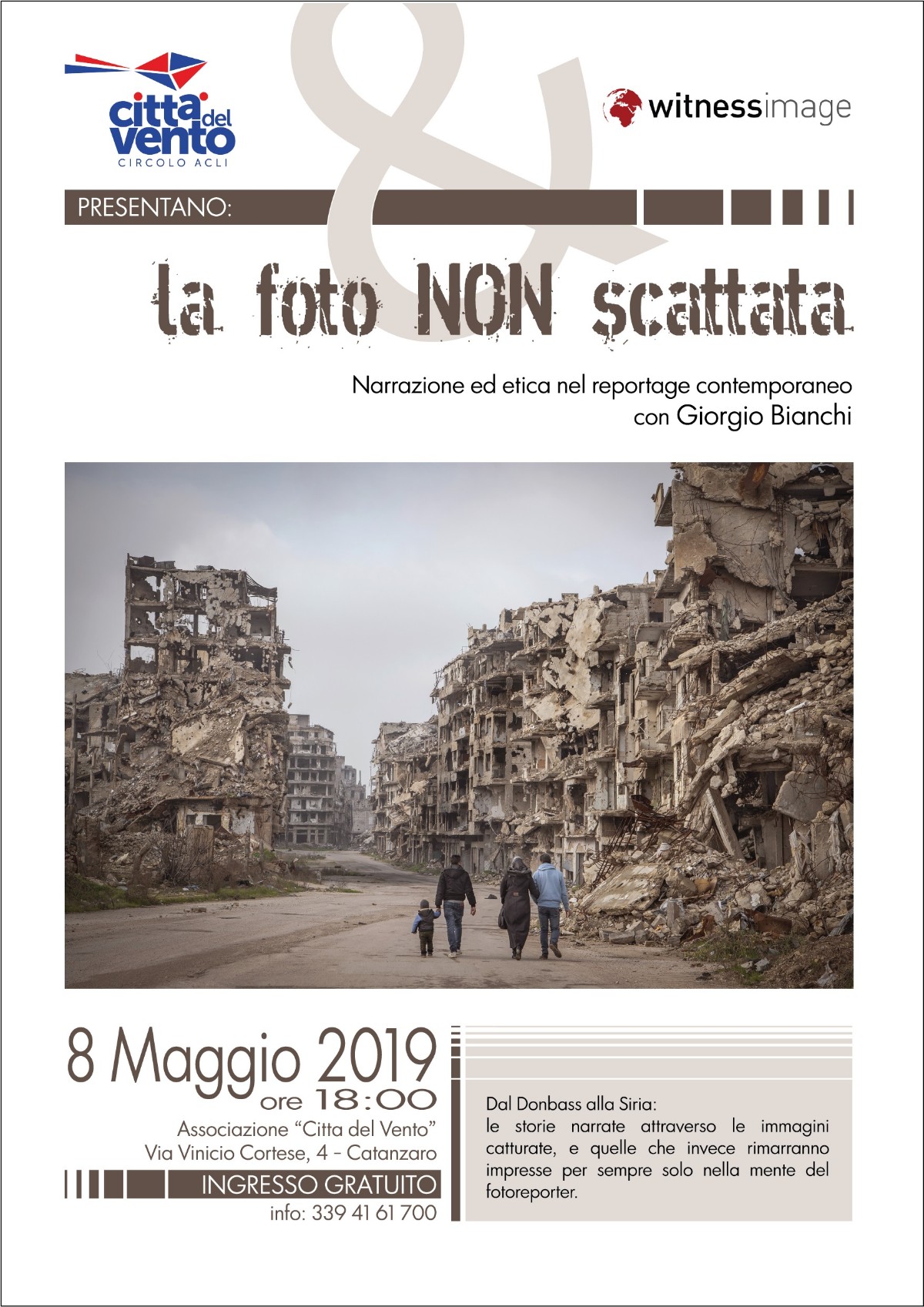 Si terrà il prossimo 8 maggio, con inizio alle ore 18.00, nella sede dell’associazione “Città del Vento” in via Cortese a Catanzaro, l’incontro con il fotoreporter Giorgio Bianchi dal titolo “La foto NON scattata”. L’appuntamento col fotografo documentarista, autore Rai e filmmaker attualmente impegnato nei conflitti di Siria e Donbass, è aperto al pubblico, ed è stato fortemente voluto da Cristina Pullano, già Socia di “Città del Vento”, organizzatrice e coordinatrice del Corso di Fotografia a cura di Angelo Maggio attualmente in itinere, e al quale faranno seguito ulteriori iniziative. Commentando il suo lavoro, Giorgio Bianchi racconterà ai presenti la realtà della guerra, e di conseguenza quanto i canali di informazione possano talvolta portarci lontano da una corretta narrazione dei fatti. Il fotoreporter ha realizzato reportage, oltre che in Europa, anche in Siria, Ucraina, Burkina Faso, Vietnam, Myanmar, Nepal e India, prestando particolare attenzione alle tematiche di carattere politico e antropologico, alternando i progetti personali a lungo termine ai lavori su commissione.
