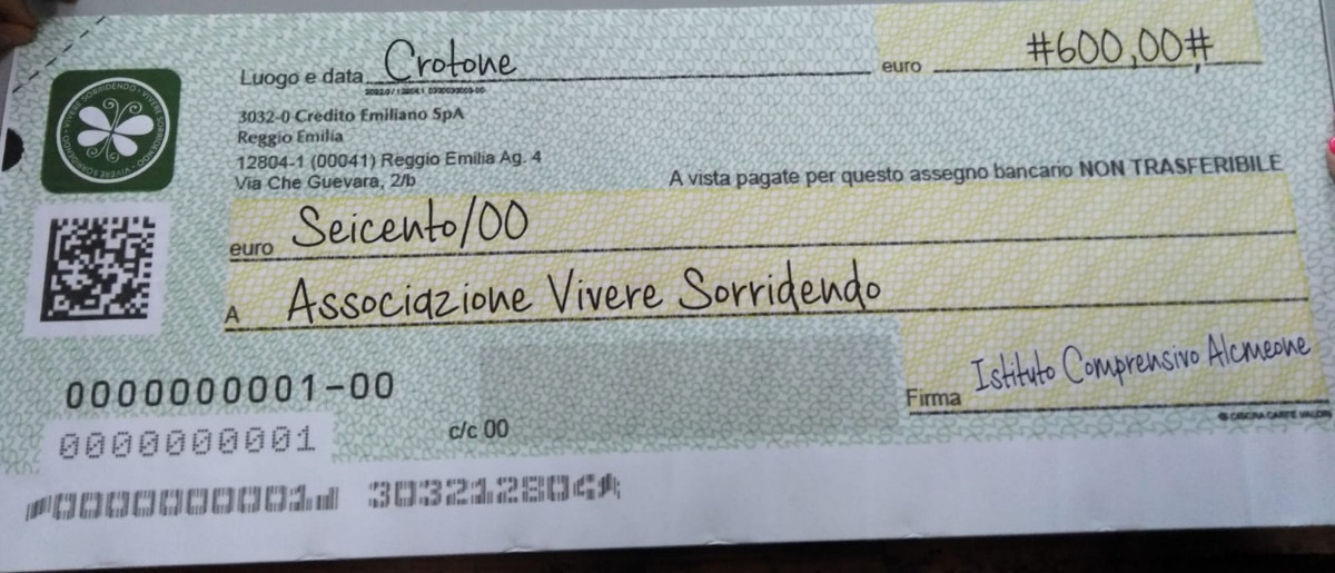Martedi 7 maggio, cerimonia di consegna presso l’ist Comprensivo Alcmeone, dove la dirigente dott.ssa Donatella Calvo ha consegnato l’assegno di simbolico della raccolta fatta a scuola.