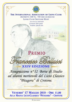 Domani 17 maggio p.v., alle ore 11.00, nell’Aula Magna del Liceo Classico “Pitagora” di Crotone, il Lions Club di Crotone Host, nel 59mo anniversario dalla sua fondazione terrà a battesimo la XXIV Edizione del Premio Francesco Bellusci.