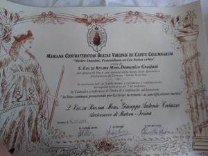 Il 16 maggio 2019 una delegazione del sodalizio mariano, guidata dal Priore Federico Ferraro e dalle Consigliere Camilla e Maria Pia Portiglia , Filomena Mustacchio e dalla consorella Manuela Rizzo, ha inteso valorizzare il legame mai interrotto con la città di Crotone , attraverso una pergamena e un targa realizzata dal cancelliere Michele Affidato.