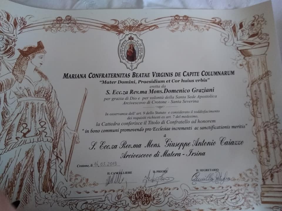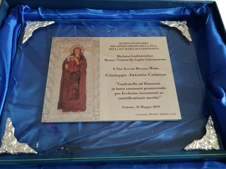 Nella festosa occasione della visita a Crotone di SE Mons. Giuseppe Caiazzo, attuale arcivescovo di Matera –Irsina e Presidente del Comitato per i Congressi Eucaristici presso la CEI, la Cattedra della Confraternita Mariana di Capocolonna Maria ha inteso conferire il riconoscimento del titolo di Confratello ad honorem con la motivazione IN BONO COMMUNI PROMOVENDO PRO ECCLESIAE INCREMENTI AC SANCTIFICATIONIS MERITIS, proprio a voler sottolineare il constante impegno del presule, nel ministero episcopale, per la crescita e la santità della Chiesa tutta!