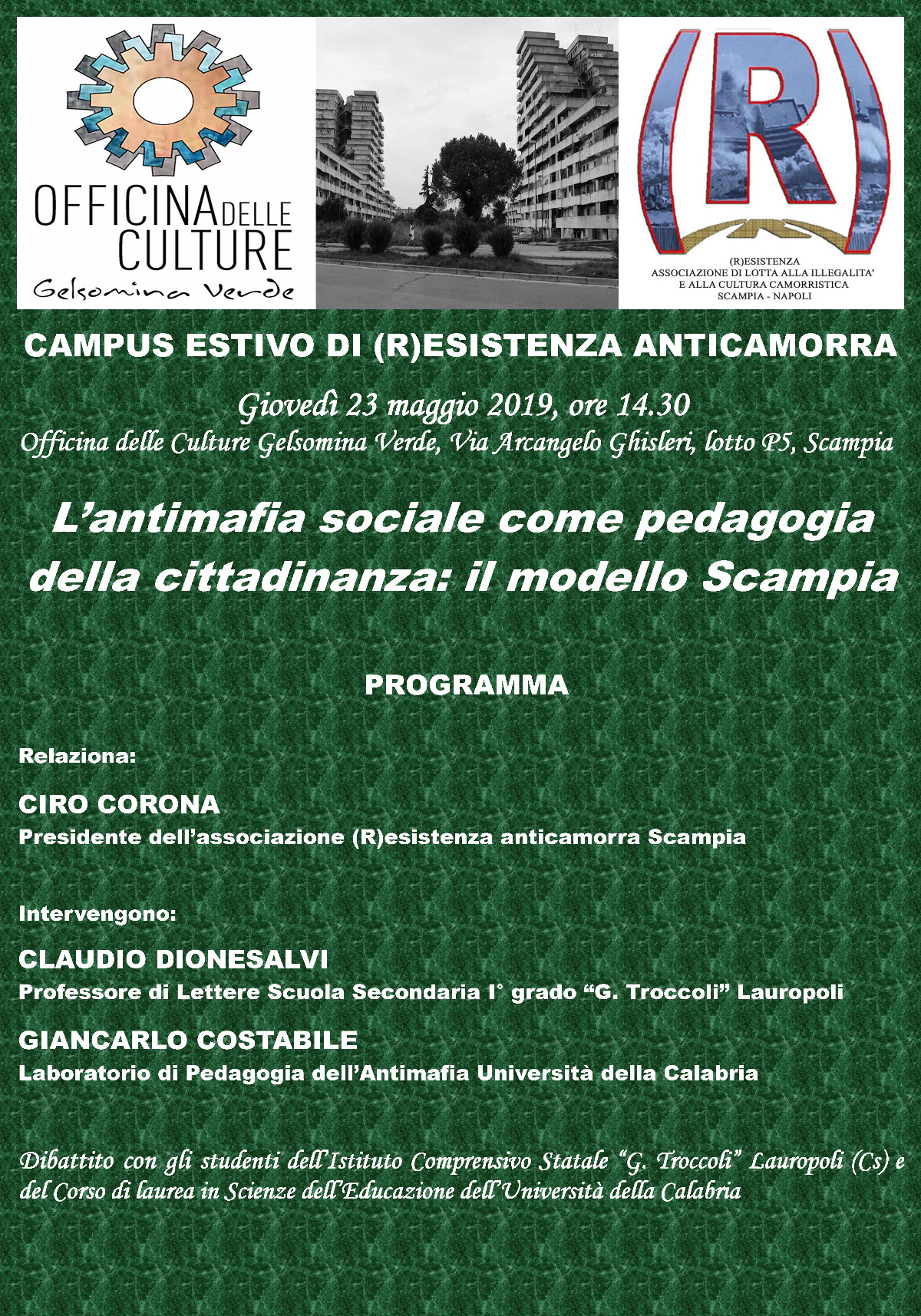 Sono questi alcuni dei temi oggetto dell’incontro che si terrà domani — giovedì 23 maggio alle 14.30 — a Scampia presso l’Officina delle Culture Gelsomina Verde al quale parteciperanno 80 studenti calabresi provenienti dalla Scuola Media “G. Troccoli” di Lauropoli e del Corso di laurea in Scienze dell’Educazione dell’Università della Calabria. All’iniziativa, organizzata nel giorno dell’anniversario della strage di Capaci in cui persero la vita il giudice Falcone e la moglie con la loro scorta, interverranno Ciro Corona, Presidente dell’Associazione (R)Esistenza Anticamorra di Scampia, e i docenti Claudio Dionesalvi e Giancarlo Costabile. Dopo il seminario, gli studenti calabresi della Troccoli e dell’Unical visiteranno insieme le Vele di Scampia e i presidi di resistenza civile che nel quartiere operano dal basso contro la camorra. L’iniziativa si inserisce nell’ambito delle attività antimafia del Campus estivo dell’associazione partenopea (R)Esistenza Anticamorra, che sta richiamando a Napoli studenti da tutto il Paese.