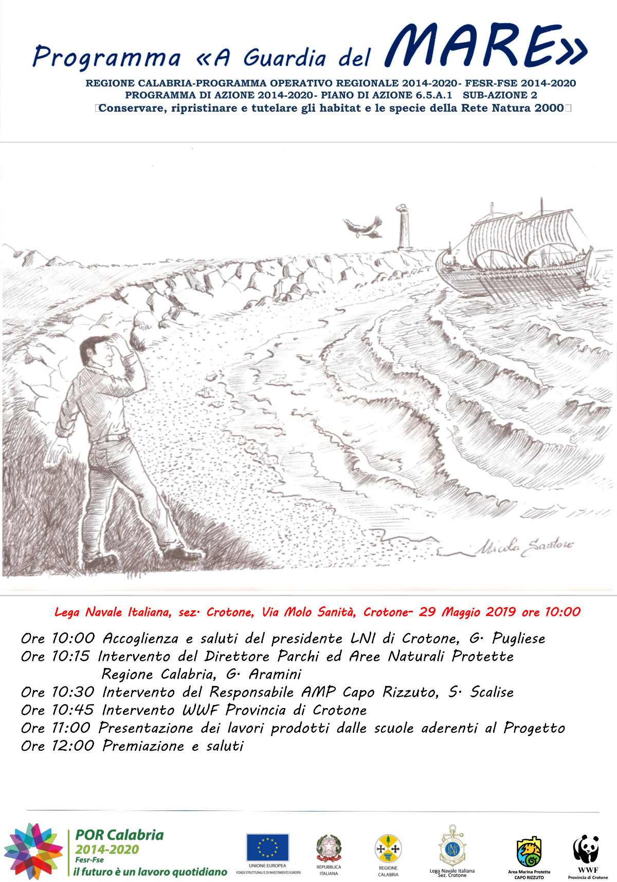 L’evento conclusivo di questo percorso si terrà il 29 maggio con la presentazione dei lavori prodotti dalle scuole aderenti al progetto e la premiazione. Per l’occasione, interverranno il presidente della LNI Crotone, Giovanni Pugliese, il direttore dei parchi ed aree naturali protette, Giovanni Aramini, il responsabile dell’Amp Capo Rizzuto, Simone Scalise e il responsabile del WWF della provincia di Crotone.
