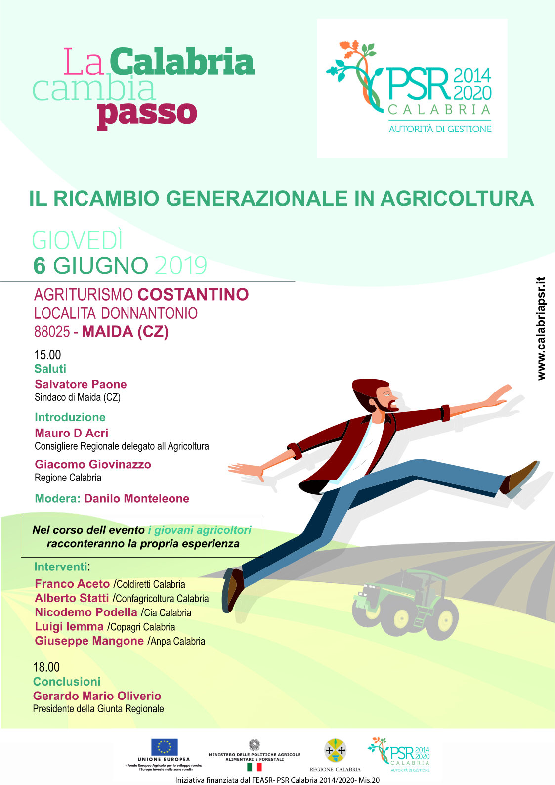Sarà il Presidente della Regione Mario Oliverio a concludere i lavori dell’evento “La Calabria cambia passo. Il ricambio generazionale in agricoltura”, che si terrà giovedì 6 giugno alle ore 15 presso l’agriturismo Costantino di località Donnantonio, Maida (Cz).