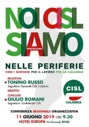 “Dobbiamo investire nella crescita e nello sviluppo, nelle infrastrutture in modo che si metta la Calabria al passo con le altre realtà del Paese”. Lo ha detto il segretario generale di Cisl Calabria Tonino Russo nel corso della conferenza stampa di presentazione dell’iniziativa ‘Noi Cisl siamo nelle periferie con i giovani per il lavoro e per la Calabria’ che si è svolta nella sala ‘Petraglia’ della Camera di Commercio di Cosenza. All’incontro con la stampa era presente anche Giuseppe Lavia segretario provinciale Cisl Cosenza che assieme a Russo hanno illustrato i contenuti della conferenza regionale in programma martedì 11 giugno con inizio alle ore 9,30 all’hotel ‘Europa’ di Rende. In quell’occasione è prevista la partecipazione anche del segretario confederale della Cisl Giulio Romani che concluderà i lavori della conferenza regionale. “Questo appuntamento – spiega Russo – cade in un momento particolare perché a ridosso della conferenza organizzativa nazionale della Cisl in programma dal 9 all11 luglio a Roma e soprattutto a pochi giorni dalla manifestazione sindacale nazionale unitaria dell’22 giugno a Reggio. Due momenti in cui la nostra organizzazione è tesa a dimostrare da un lato come stare ancor più accanto alle persone e ai territori e dall’altro soprattutto a sostenere le nostre proposte per rilanciare un’economia che segna il passo e non è in grado più di garantire futuro al Sud e alla Calabria in particolare”. “Dalla nostra regione – ricorda Russo – ogni anno fuggono 4mila giovani, molti dei quali con un livello culturale alto. Un aspetto che suona come una beffa oltre che un danno per quelle famiglie obbligate ad indebitarsi per sostenere gli studi dei propri figli e poi costrette ad assistere alla loro fuga che diviene occasione di sviluppo in altre regioni del Paese”.