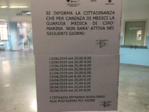 Arriva come un fulmine a ciel sereno la notizia tramite una tabella all’interno dei locali dell’Asp di Cirò Marina, che indica gli orari di apertura nel mese di giugno.