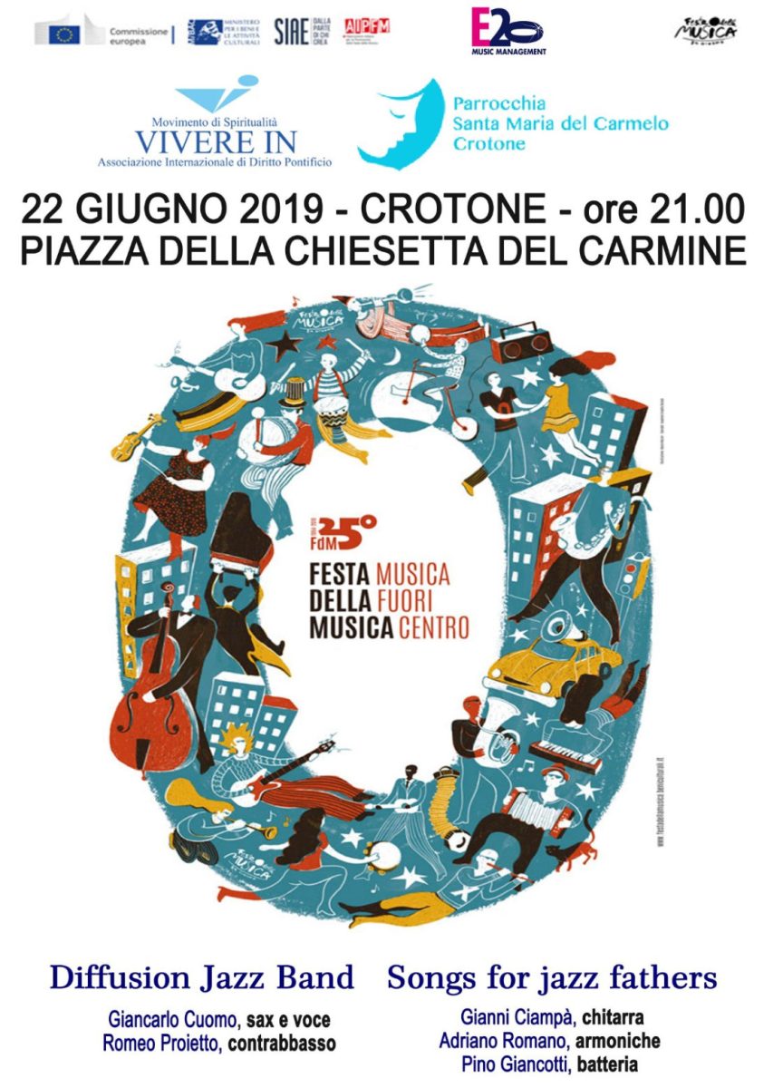 Nella suggestiva piazza della Chiesetta del Carmine, sul Lungomare di Crotone, tutti sono invitati a festeggiare insieme l’arrivo dell’estate lasciandoci conquistare dalle note jazz della Diffusion Jazz Band (Giancarlo Cuomo, sax e voce; Romano Proietto, contrabasso; Gianni Ciampà, chitarre; Adriano Romano, armoniche; Pino Giancotti, batteria)