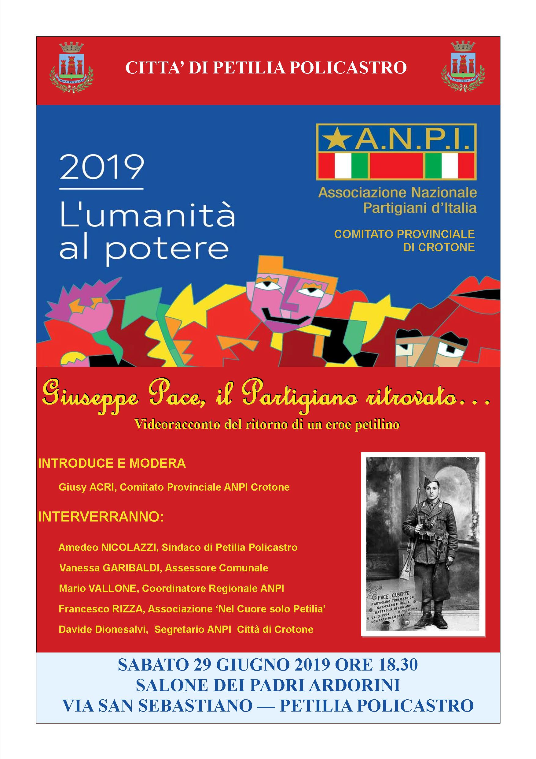 “L’Umanità al potere. Giuseppe Pace, il partigiano ritrovato” è il titolo dell’iniziativa dedicata allo stesso partigiano la cui storia, negli ultimi anni, è stata sottratta dal dimenticatoio grazie alla caparbietà della cognata Santa che, fra le altre cose, è riuscita a riportare le spoglie di Giuseppe Pace, sino ad allora, seppellite nelle Marche, a Petilia Policastro.