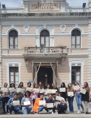 Le classi sono state chiamate a creare storie multimediali interattive usando 1001Storia, uno strumento autore creato da HOC-LAB. Sulla base della tecnica del digital storytelling, cioè il raccontare storie combinando testi, immagini, audio, video. Gli studenti, coordinati dalla prof.ssa Giovanna Ripolo, hanno elaborato un prodotto multimediale dal titolo “Pitagora. L’esempio pitagorico tra antico e moderno”. La prof.ssa Ripolo a proposito del progetto: L’idea di creare un prodotto multimediale sulla figura del filosofo mi è venuta contestualmente allo studio su Pitagora presente nella programmazione di filosofia nel terzo anno. Parlandone con la classe abbiamo intrapreso il percorso di realizzare un prodotto multimediale comprendendo la valenza formativa di approfondire alcuni argomenti con l’ausilio della tecnologia. Siamo partiti in primo luogo dalla conoscenza del filosofo e delle sue idee nel relativo contesto storico. Successivamente ci si è mossi applicando i concetti acquisiti lungo il percorso e sviluppando il confronto dialogico al di là dei limiti dei testi filosofici e degli avvenimenti storici proposti e inserendoli nell’attualità e nel contesto del nostro vissuto. Abbiamo quindi individuato i temi da trattare e le diverse modalità e, dividendo i compiti in base ad interessi e competenze e lavorato sviluppando le varie tematiche abbiamo approfondito la vita, il contesto storico, gli influssi su matematica, musica e scienza. Abbiamo poi riportato tutto ai luoghi più vicini al filosofo e a noi. Abbiamo infatti visitato il Museo Pitagora e realizzato delle ricerche sul nostro Liceo che è intitolato a Pitagora. Abbiamo utilizzato inoltre varie modalità e gli studenti hanno realizzato relazioni dettagliate, preparato immagini da abbinare e registrato gli audio per ogni scheda. In una delle schede abbiamo utilizzato anche la lingua inglese per poter meglio veicolare il messaggio. Sono stati realizzati dei video dove gli studenti hanno utilizzato tutta la loro creatività. E’ stato scelto, anche per la conclusione, di realizzare un video che rapportasse la modernità alla classicità eterna del filosofo. La diffusione delle conoscenze su Pitagora e sui suoi insegnamenti è stata arricchita, grazie all’elaborazione di questo prodotto, da tante informazioni storiche acquisite non solo da libri e internet ma grazie anche a esperti del territorio che hanno dato un preziosissimo contributo. L’intero processo formativo, nato inizialmente come approfondimento di un argomento curricolare, e cioè la figura di Pitagora filosofo, è diventato un momento importante che ha portato al coinvolgimento dell’intero gruppo classe a seconda le inclinazioni. Le difficoltà sorte sono state soprattutto di ordine pratico e legato ai tempi di lavoro ma siamo riusciti tutti assieme a fronteggiare gli ostacoli e riuscendo a realizzare il prodotto di cui siamo “profondamente” orgogliosi!