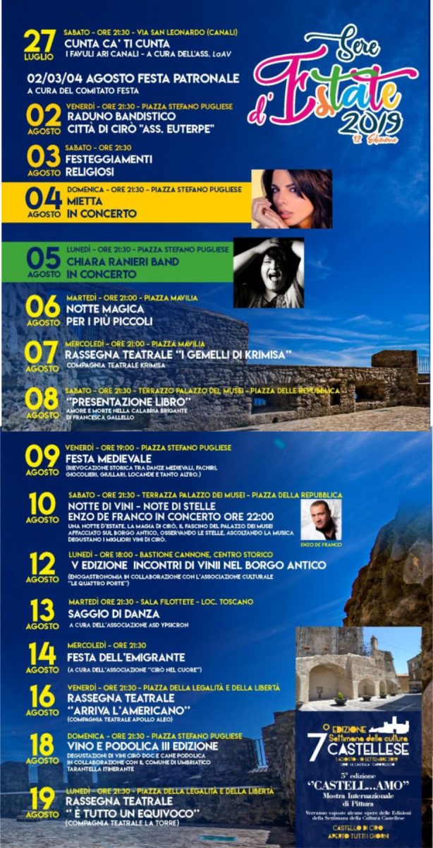 Tradizioni, musica, arte e cultura nel borgo, sono, questi, gli ingredienti della proposta culturale e tradizionale presentata a partire dal 27 luglio con la manifestazione “Cunta ca ti cunta”presso “I Canali” a cura dell’associazione LAAV. Il 2 agosto si terrà il Raduno bandistico” Città di Cirò” dell’Associazione Euterpe che aprirà le tre giornate dedicate alla festa patronale dei Santi Francesco Di Paola e Nicodemo di Cirò che culminerà con il concerto della cantante Mietta il giorno 4 agosto. Proseguirà con la notte magica per i più piccoli il 6 agosto in piazza Mavilia, il 7 agosto con la rassegna teatrale “I Gemelli di kremisa” a cura della compagnia teatrale ”Krimisa”. Proseguirà l’estate cirotana sabato 8 agosto con la presentazione del libro “Amore e morte nella Calabria brigante” di Francesca Gallello; Il 9 agosto festa medievale ( rievocazione storica); il 10 agosto notte dei vini: note di stelle con il cantante Enzo De Franco in concerto. Si terrà il 12 agosto la tanto attesa IV edizione di” Incontri di vini nel borgo” organizzato dall’associazione “Le Quattro porte”. Seguirà il 13 agosto un saggio di danza a cura dell’associazione “ASD Ypscron”; il 14 agosto si terrà la festa dell’emigrante a cura dell’associazione ”Cirò nel cuore”; il 16 agosto si terrà invece la rassegna teatrale ”Arriva l’americano” della regista Filomena Zungri. E ancora il 18 agosto si terrà la terza edizione di “Vino e Podolica” con degustazione e tarantelle; ed infine a chiudere la lunga estate cirotana la Rassegna teatrale: “E’ tutto un equivoco” della compagnia “La Torre”.