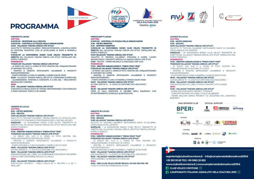 Tutto pronto per l’inizio del Campionato Italiano Assoluto di Vela 2019 – trofeo BPER Banca, organizzato dalla Federazione Italiana Vela insieme al Club Velico Crotone e all’Unione Vela d’Altura Italiana, che si disputerà a Crotone dal 16 al 20 luglio.