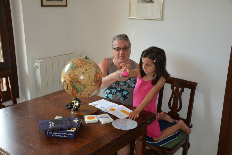Intanto, nonno Andrea la sta coltivando con molta attenzione e, accortosi che il racconto sull’universo incanta la nipotina Giulia, le ha comprato “Il mio cofanetto Montessori di astronomia”. Chissà che, appassionandosi allo studio e alla conoscenza del firmamento, Giulia non diventi veramente una grande astronoma … o magari un’astronauta … o una scienziata da premio Nobel, benefattrice dell’umanità!