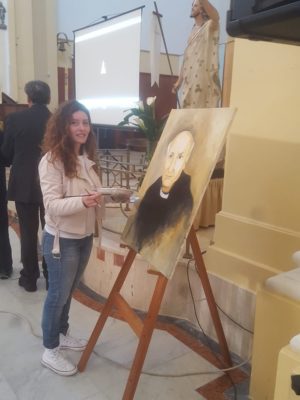 La giovane (nata nel 1975) artista cutrese, sin dai banchi della scuola elementare esternava la sua naturale propensione verso l’arte pittorica e ciò lo può testimoniare chi scrive questa nota essendo stato suo insegnante. I suoi successivi studi si sono diversificati tra arte e fede: ha frequentato il liceo artistico di Catanzaro e successivamente, nel 2010, ha conseguito il Baccalaurato in Teologia presso la Facoltà teologica “San Pio X” sempre nel capoluogo calabro. Oggi è apprezzata e stimata insegnante di Religione presso il mitico Istituto d’Istruzione Superiore “G. Gangale” di Cirò Marina. Negli anni ha intensificato la passione e la maestria nella pittura tra paesaggi, figure, nature morte e ritratti. Tra le non poche attività annoveriamo: mostre collettive al castello di Crotone; una personale nel chiostro del municipio di Cutro sul tema attualizzato della passione, morte e resurrezione di nostro Signore illustrata con successo agli alunni della scuola primaria, con l’obiettivo, come dice la stessa Arabia, “far comprendere come noi non siamo soli se apriamo la nostra vita al Signore e viviamo secondo i Suoi comandamenti; insomma, attraverso la fede i problemi della quotidianità si possono affrontare con serenità.” Successivamente la mostra “Via Crucis”, attraverso il percorso identitario delle cinque chiese cutresi con una tela esposta nell’antica chiesetta delle Monachelle. Altra tela, raffigurante l’apostolo Pietro sul lago di Tiberiade, la si può ammirare nella chiesa di Le Castella. Nell’ultimo biennio, per rinverdire le antiche tradizioni del paese, ha ideato, con altre signore del luogo e con esposizione dei lavori, laboratori di ricamo; e ancora, laboratori di pittura per bambini e nel prossimo futuro anche laboratori di scultura. Infine, lo scorso 5 maggio, durante la Giornata dedicata all’amato parroco don Michele Bertola, nella chiesa parrocchiale della SS. Annunziata, la nostra artista ha realizzato in estemporanea un ammirevole ritratto del prete piemontese.