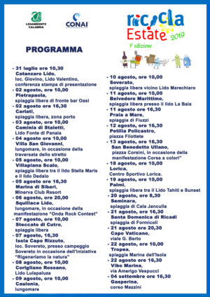 È stato presentato mercoledì 31 luglio presso il Lido Valentino in località Giovino a Catanzaro Lido il programma di Ricicla Estate, la campagna di Legambiente Calabria che si tiene per il quinto anno consecutivo grazie al prezioso contributo del Conai.
