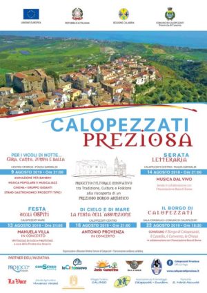 5 gli appuntamenti di “Calopezzati Preziosa” che arricchiscono ulteriormente il ricco cartellone dell’Estate Calopezzatese: s’inizia il 9 agosto con “Per i vicoli di notte… Gira, canta, zumpa e balla”, si prosegue il 13 agosto con la “Festa degli Ospiti” e la nota artista Manuela Villa in concerto, 14 agosto con la “Serata Letteraria” e musica dal vivo, il 16 agosto con “Di Cielo e di Mare: la Festa dell’Assunzione” con Antonio Provenza in concerto, e infine il 22 agosto con un convegno sul tema “Il Borgo di Calopezzati, il Castello, il Convento, le Chiese”. Eventi pensati e realizzati tenendo presenti tutte le peculiarità del territorio comunale, dal centro storico al mare, e per soddisfare al meglio le esigenze di quanti intendono trascorrere un periodo di vacanze all’insegna del divertimento e della cultura percorrendo le strade, la storia, l’arte e la memoria di Calopezzati.