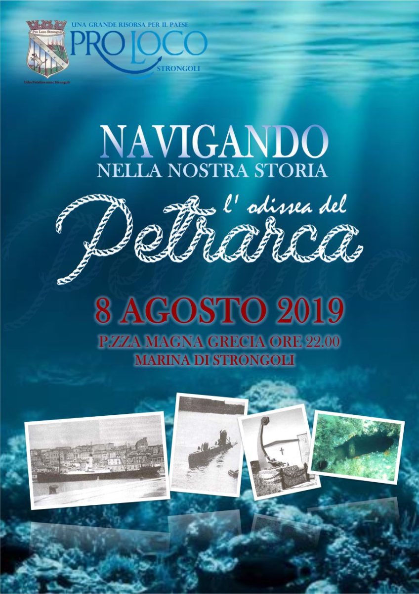 Si terrà giovedì 8 agosto il convengo “navigando nella nostra storia, l’Odissea del Petraca”. Si parlerà del piroscafo Petrarca abbattuto da un siluro britannico nel corso della Seconda guerra mondiale nelle acque di Strongoli. Un evento rimasto negli annali della guerra mondiale e che sarà ricordato con testimonianze e video inediti. In Piazza Magna Grecia alle ore 22 sarà presentato un video realizzato da Arnaldo Cantafora che ripercorrerà in 9 minuti tutte le fasi che portarono il 15 febbraio del 1943 all’affondamento della nave Petraca nelle acque di Strongoli.