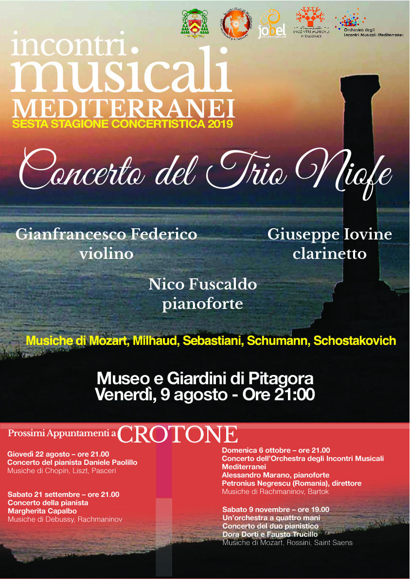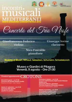 Il Trio Niofe, composto dai musicisti calabresi Gianfrancesco Federico al violino, Giuseppe Iovine al clarinetto e Nico Fuscaldo al pianoforte, venerdì 9 agosto alle ore 21, sarà ospite della Stagione Concertistica “Incontri Musicali Mediterranei” presso il Museo di Pitagora.