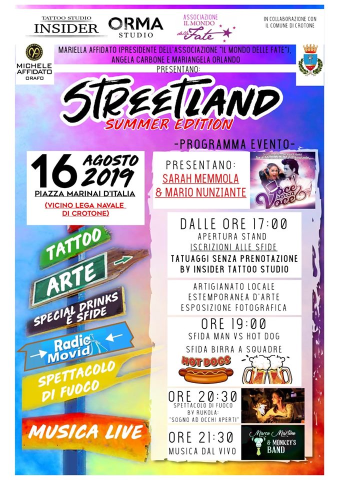Si terrà il prossimo 16 agosto in piazza Marinai d’Italia l’iniziativa “Street Land Summer Edition 2019” promossa dall’Associazione “Il mondo delle Fate” presieduta da Mariella Affidato in collaborazione con Angela Carbone e Mariangela Orlando, patrocinata dal Comune di Crotone.