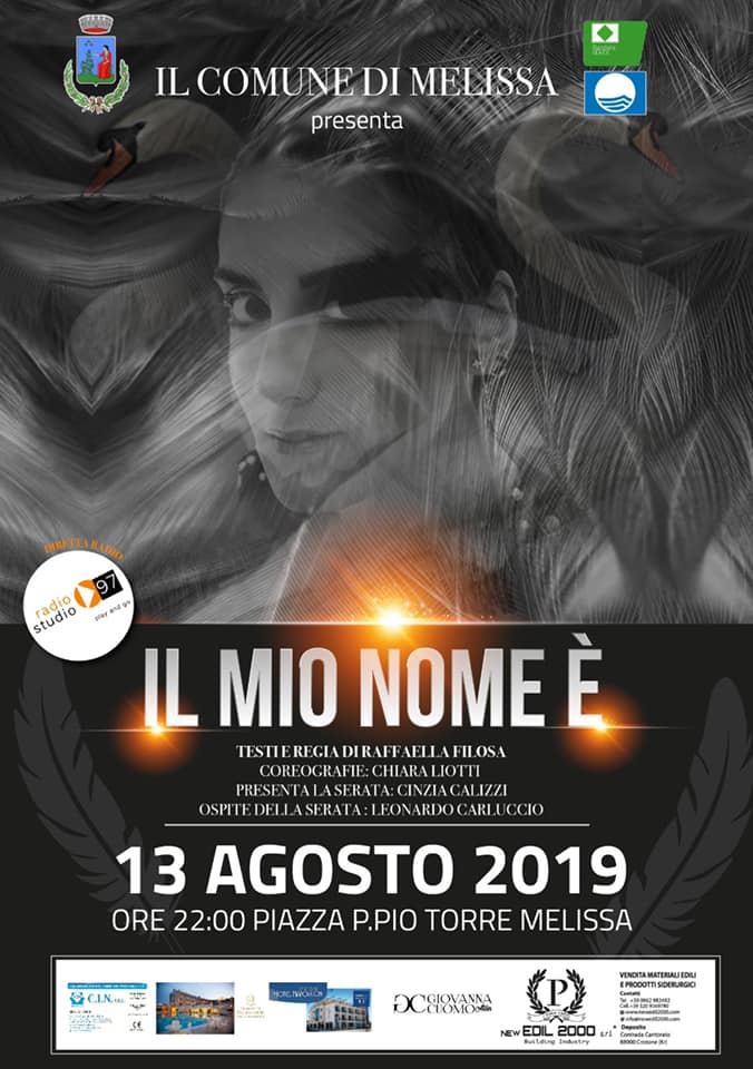 Domani 13 agosto 2019 ore 22.00 Piazza Padre Pio Torre melissa, la giovane e ormai famosa artista locale Raffaella Filosa, attrice, cantautrice e sceneggiatrice, porterà in scena la prima dello spettacolo IL MIO NOME E’ scritto e diretto da lei. La giovane ha studiato e lavorato a Roma con grandi artisti. Dopo aver debuttato su numerosi palchi in tutta italia con artisti del calibro di Grazia di Michele, studiato presso l’Accademia Actors Planet di Rossella Izzo, ha poi avuto modo di recitare sotto la direzione di Simona e Rossella Izzo, Fioretta Mari, Federico Moccia, Giulio Manfredonia e tanti altri; Quest’anno ci propone il suo nuovo spettacolo pieno di effetti scenografici. Uno spettacolo tutto al femminile, dove si parlerà di tante tematiche attraverso la voce delle donne. Tra le tematiche ricordiamo la violenza sulle donne e sui bambini, il bullismo, la lotta per i diritti umani, e tante altre! Sarà l’occasione per presentare anche alcuni suoi nuovi brani… tra questi, SIAMO UMANI, che sarà la colonna sonora di un progetto cinematografico alla quale Raffaella sta lavorando in questi mesi. Sul palco insieme a lei grandi musicisti quali Max Mungari, Frank Cori, Davide Calabretta e Cristian piperis ; con la partecipazione di Leonardo Carluccio dei Carboidrati, al pianoforte. Le coreografie saranno a cura della maestra chiara liotti dell’etoil academy e vedranno in scena anche Francesco Lerose e Anna Malena. Evento assolutamente da non perdere.