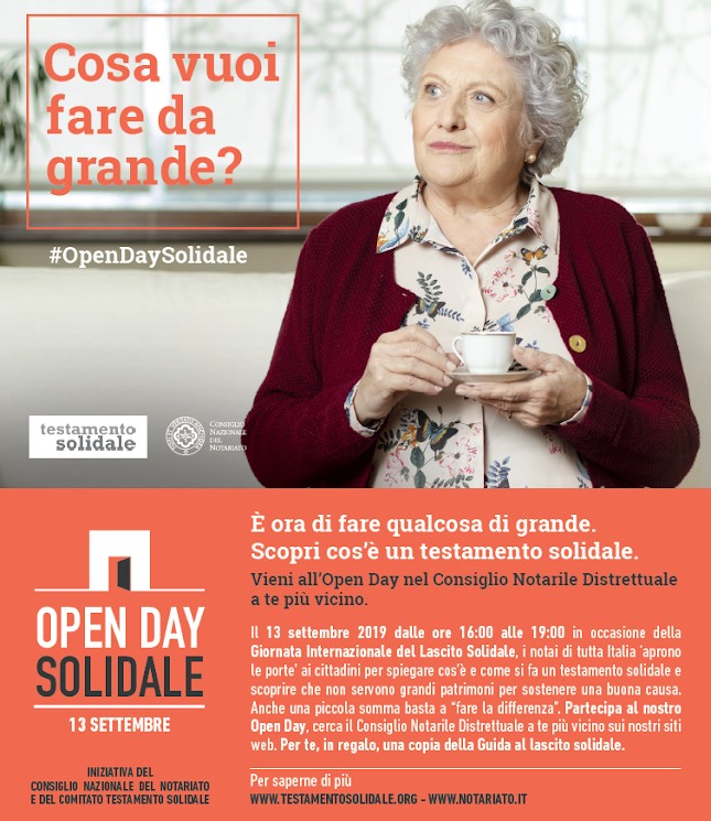 Il 13 settembre, in occasione della Giornata Internazionale del Lascito Solidale, il Comitato Testamento Solidale insieme con il Consiglio Nazionale del Notariato presentano il primo Open Day Solidale, per offrire, gratuitamente, informazioni su cos’è e come funziona il testamento solidale.