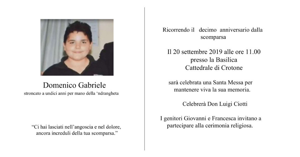 Ricorrendo il decimo anniversario dalla scomparsa del piccolo Domenico (Dodò) Gabriele, il 20 settembre 2019 alle ore 11.00 presso la Basilica Cattedrale di Crotone sarà celebrata una Santa Messa per mantenere viva la sua memoria.