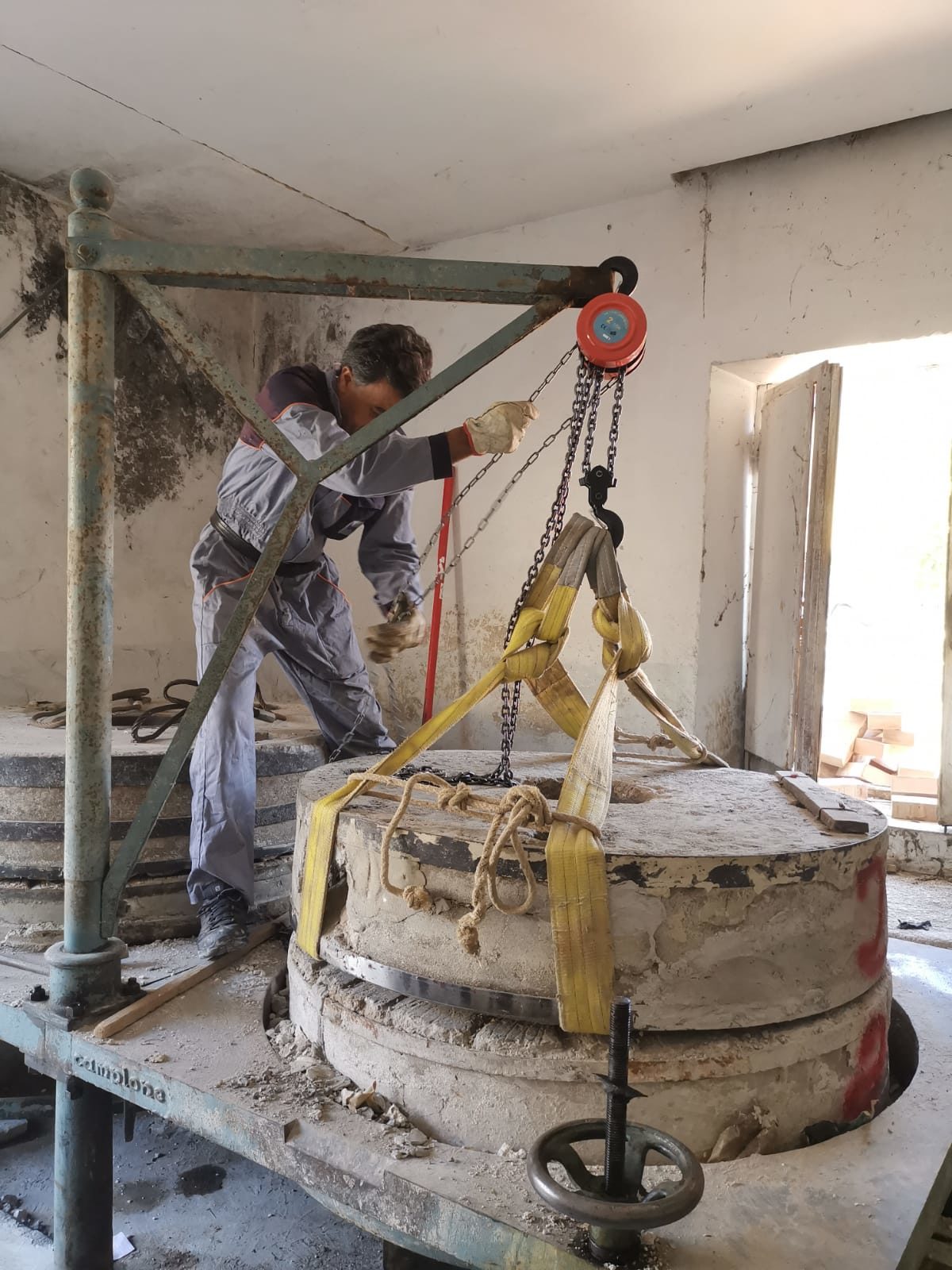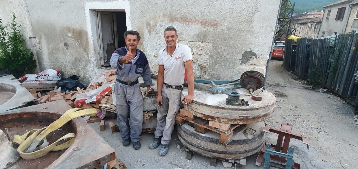 La squadra dell’officina Mulinum con gli operai del posto ha armeggiato con chiavi inglesi, flessibili e grandi chiavi, il bobcat ha trasportato le macine: l’antico mulino, costituito da due macine riviste e cassa in ferro, diverse dal classico modello a cui si è abituati in Calabria, è stato tratto in salvo.