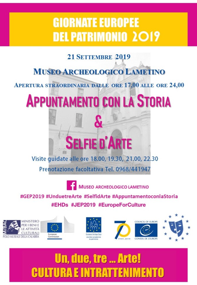 Il Museo archeologico lametino prende parte alle GEP – Giornate Europee del Patrimonio 2019 con l’apertura straordinaria (pomeridiana e serale) del 21 settembre 2019 e con le iniziative Appuntamento con la Storia e Selfie d’arte.