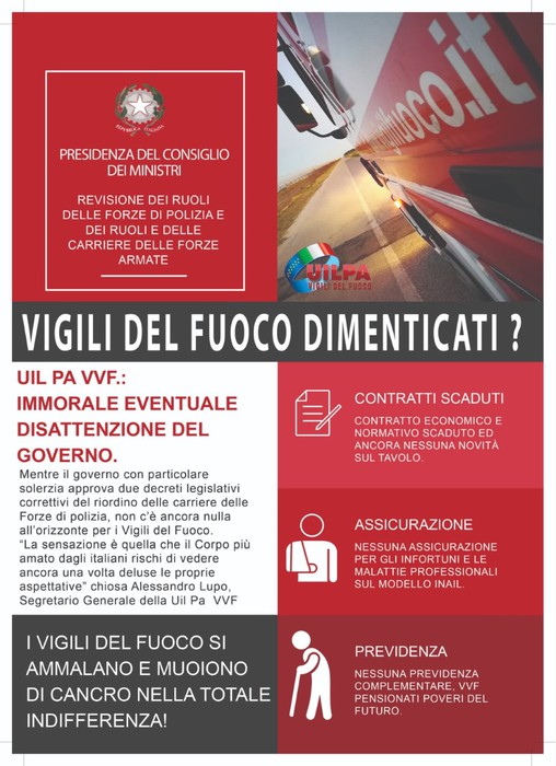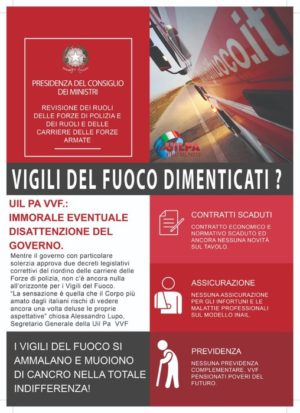“La speranza è quella che il Corpo più amato dagli italiani non rischi di vedere ancora una volta deluse le proprie aspettative” chiosa Alessandro Lupo, Segretario Generale della Uil Pa Vigili del Fuoco, restano infatti ancora senza risposte temi importanti come il rinnovo del contratto sia normativo che economico, l’assicurazione obbligatoria per gli infortuni e le malattie professionali, le tutele previdenziali che faranno dei Vigili del Fuoco i pensionati poveri di un futuro ormai prossimo, le tutele per la sicurezza dei Vigili del Fuoco che si ammalano e muoiono di cancro nell’indifferenza più totale.