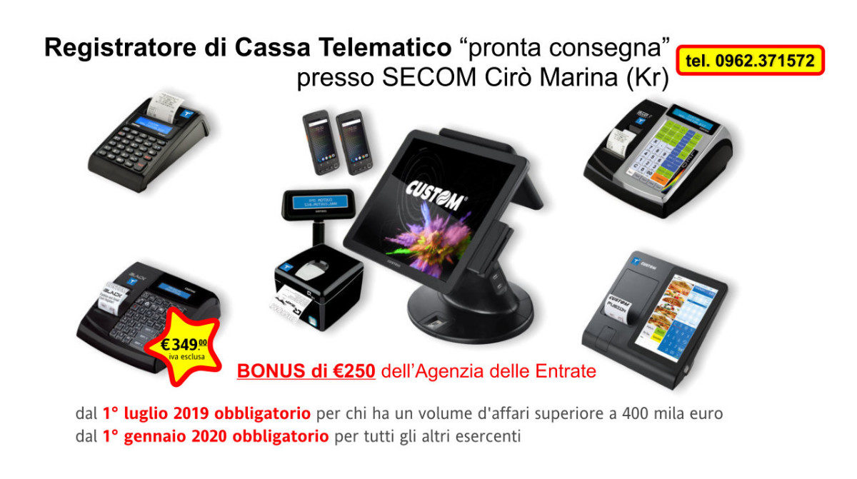 Per qualsiasi ulteriore informazione sulla “lotteria degli scontrini” oppure per acquistare un “Registratore di Cassa” Telematico di nuova generazione, potete contattare la SECOM di Giuseppe Benevento, Via Cosenza 32 – 88811 Cirò Marina (Kr) Tel. e Whatsapp 0962 371572 oppure via email: info@secom.it