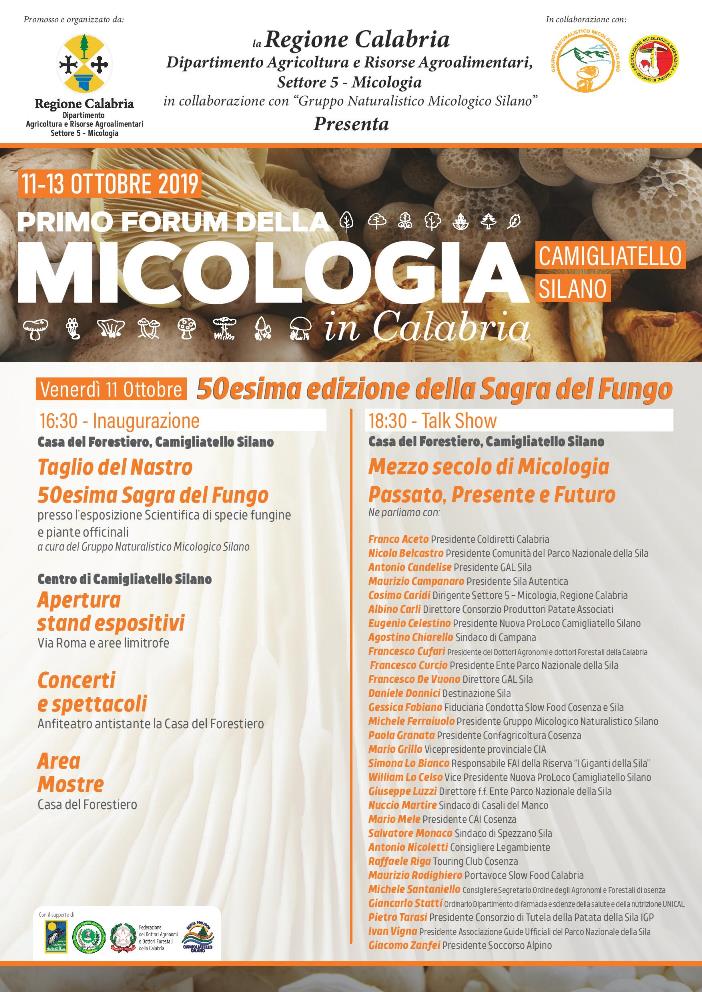 Prima del Forum, grazie sempre al supporto e all’impegno degli attori istituzionali e alle associazioni, si terrà l’inaugurazione della 50^ Edizione della Sagra del Fungo, venerdì 11 ottobre, sempre a Camigliatello Silano. Per l’occasione, in seguito al taglio del nastro e all’apertura di tutti gli stand espositivi e dell’area mostre, si svolgerà un vero e proprio talk show dal titolo “Mezzo secolo di Micologia – Passato, Presente e Futuro”, dove importanti ospiti istituzionali e rappresentanti di imprese e associazioni locali si confronteranno sulla storia del comparto micologico calabrese, analizzando problematiche, esperienze virtuose e opportunità per il futuro del settore. Tutto ciò, per gettare le basi di altri 50 anni di successi e capacità di animazione del territorio, per la sempre più amata e attrattiva Sagra del Fungo.