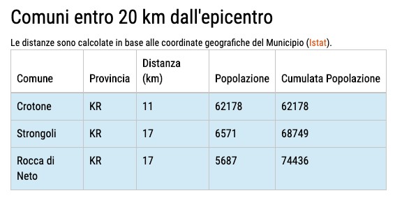 Un Terremoto di magnitudo ML 2.1 è avvenuto oggi 10 ottobre alle ore 8:07, nella Costa Ionica Crotonese, esattamente nelle acque di zona Gabella di Crotone, con coordinate geografiche (lat, lon) 39.17, 17.2 ad una profondità di 9 km.
