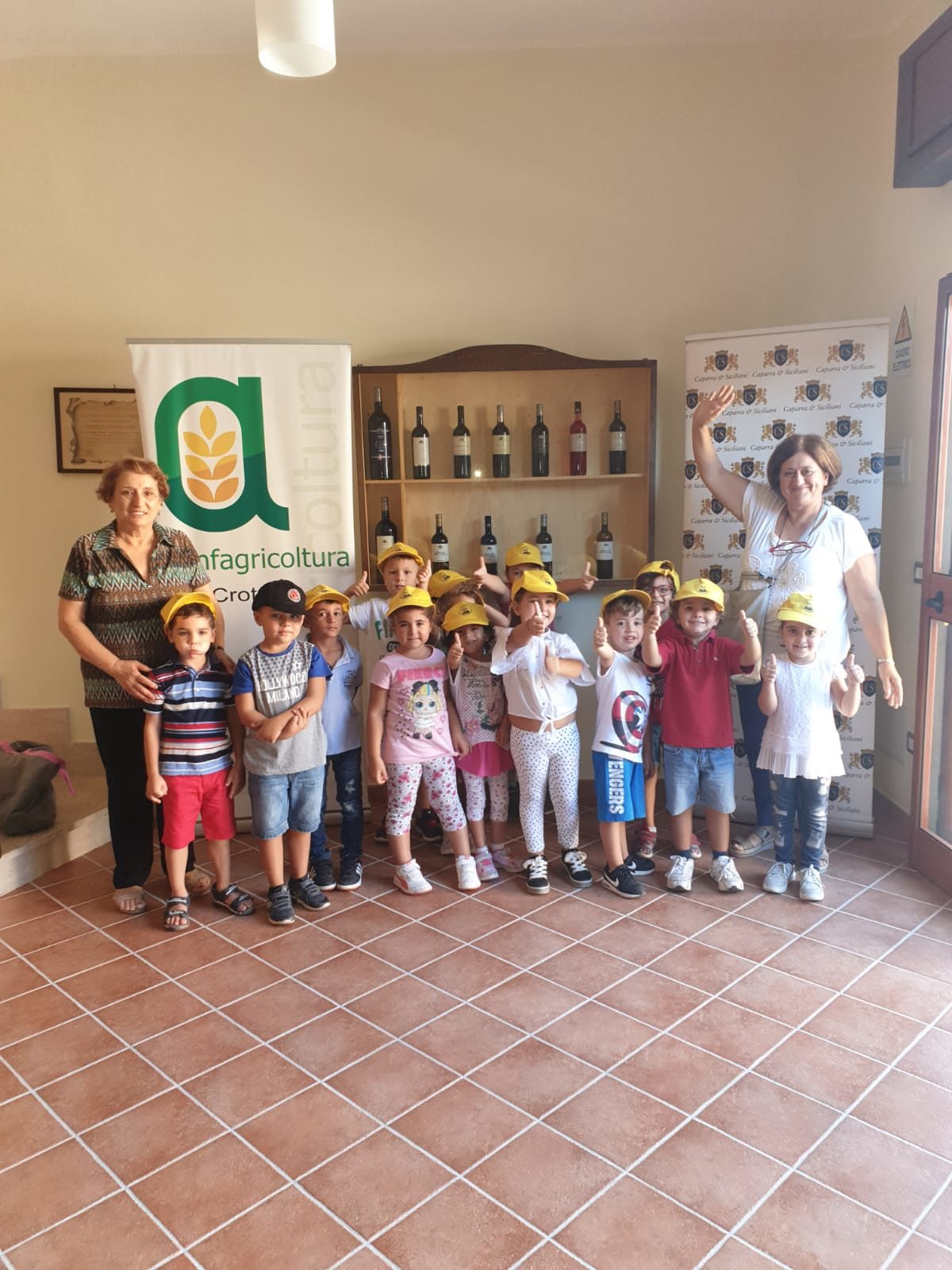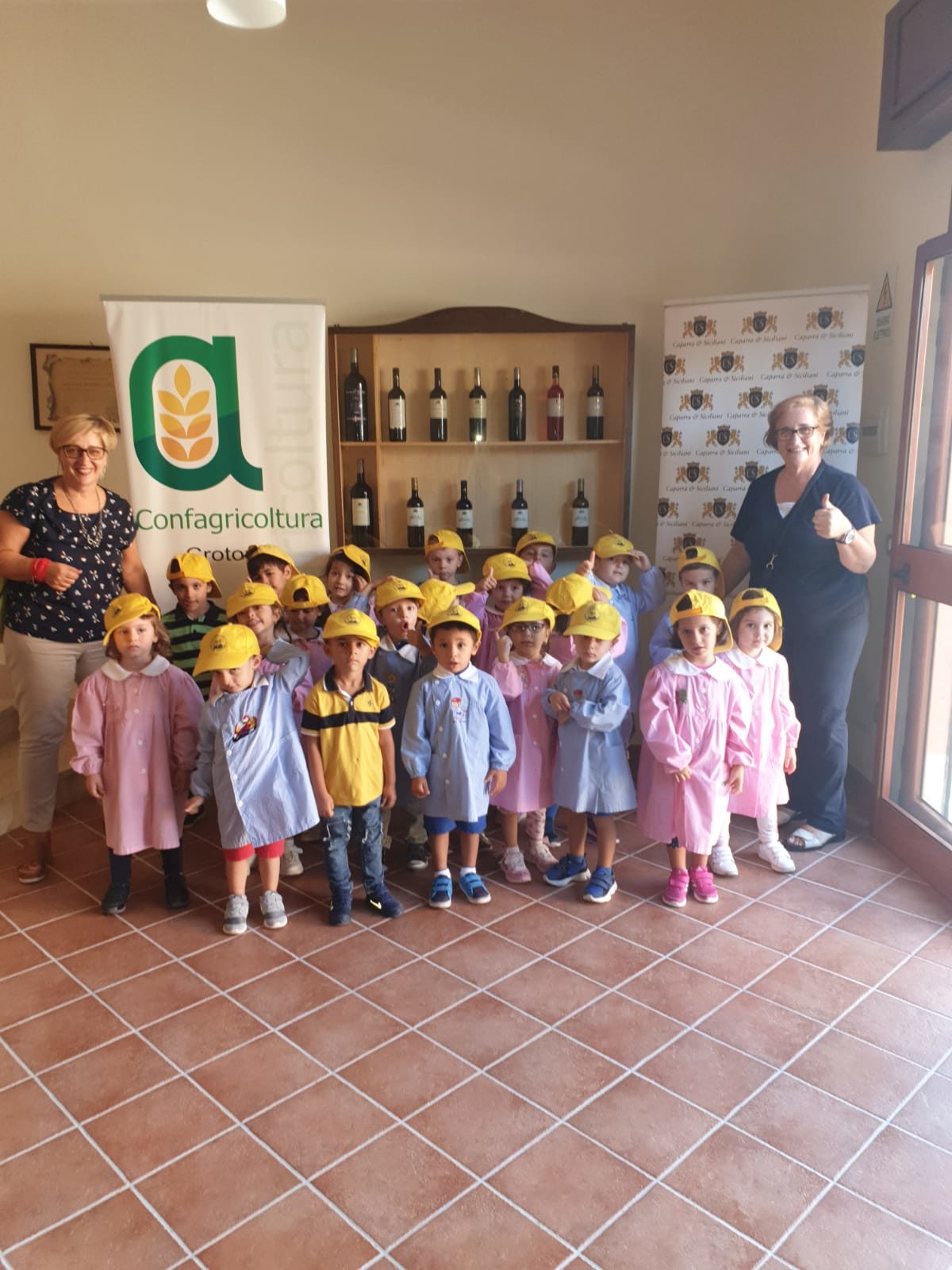 Nei giorni 1-2-3 ottobre si sono svolte presso la sede dell’azienda vitivinicola “Caparra & Siciliani”, le visite guidate degli alunni della scuola dell’infanzia dell’Istituto “Casopero” di Ciro’ Marina. Con molto interesse e partecipazione, i plessi “Affatato”, “Don Vitetti” e ” Capo Trionto” sono stati ospiti del Dott. Salvatore Caparra, in un progetto ideato in collaborazione con Confagricoltura Ciro’ Marina. L’idea della Confagricoltura era quella in effetti di non mostrare soltanto nelle vigne l’uva e fare una semplice merenda, ma di cercare di spiegare tutte le varie fasi di lavorazione che portano alla conversione fino al prodotto finito, nell’ottica di educare le giovani generazioni a produrre e trasformare le materie prime nella propria terra. Il dott. Salvatore Caparra, nella veste inoltre di Vice Presidente di Confagricoltura Crotone, è stato capace di appassionare anche i piccoli osservatori e spiegare, nei minimi particolari, tutte le attività, mostrando tutti i mezzi, dalla macina fino alle vasche di fermentazione, rendendoli sempre partecipi di tutto in cantina. Con l’aiuto costante e attento delle insegnanti e grazie all’aiuto dei dipendenti dell’azienda, i piccoli ospiti hanno avuto la possibilità di vedere tutto e in prima linea: tre giorni intensi in piena vendemmia e avendo l’ occasione di toccare con mano il prodotto. In un tempo in cui non si valorizza la nostra produzione agricola, importando alimenti dall’estero e con la perdita delle nostre tradizioni, la ditta “Caparra & Siciliani” ha dimostrato con la sua storia di mantenere vive le proprie origini e tramandare di generazione in generazione i propri valori. Per la splendida riuscita del progetto si ringraziano le insegnanti e il dirigente scolastico dell’Istituto Casopero Michele Serra, la disponibilità e cortesia del Dott. Caparra, la gentilezza di tutti i dipendenti della cantina ” Caparra & Siciliani “, l’apertura a tali eventi da parte del Presidente Provinciale Confagricoltura Crotone, Avv. Diego Zurlo, e l’attenzione costante dei piccoli protagonisti. Uno degli slogan di Confagricoltura è “Coltiviamo Capolavori”, non ci possono essere capolavori più belli dei bambini, custodi delle nostre tradizioni.