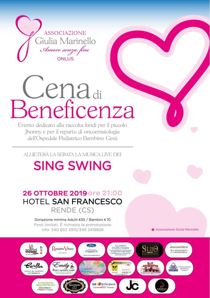 Sabato 26 ottobre l’associazione Giulia Marinello “Amore senza fine” sta organizzando una “Cena di Beneficenza” presso l’Hotel San Francesco a Rende, evento dedicato alla raccolta fondi per Johnny e per il reparto di oncoematologia dell’Ospedale Pediatrico Bambino Gesù.