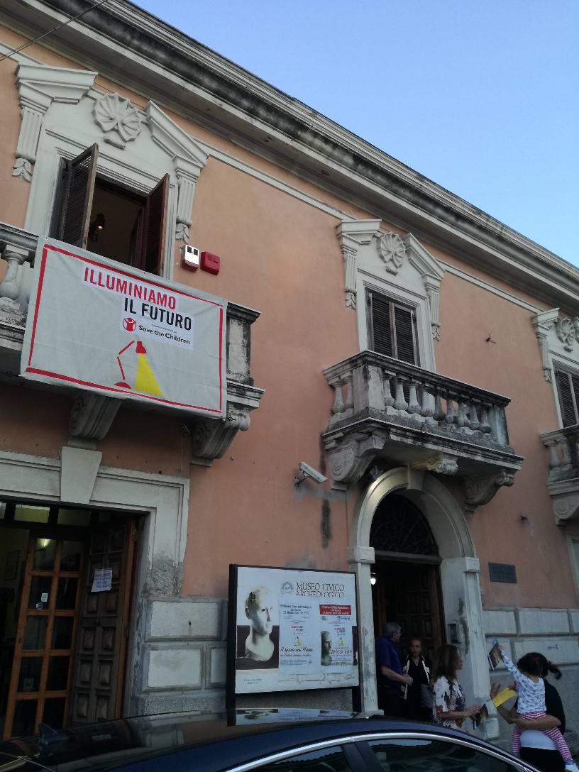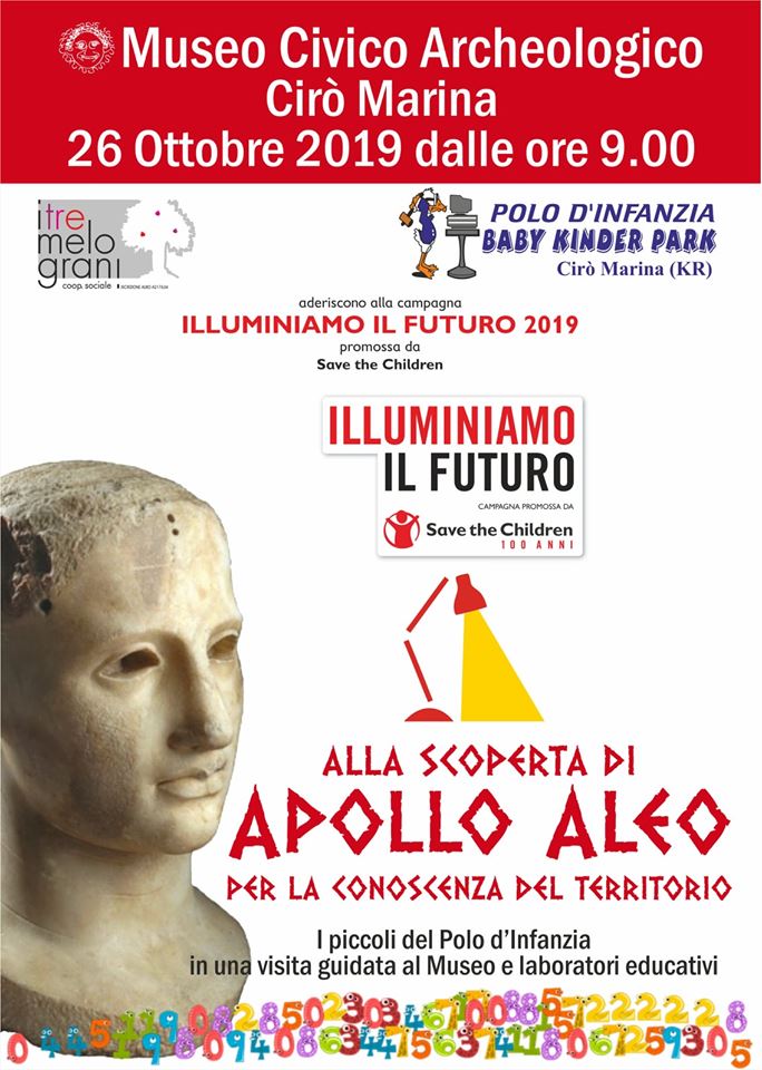 Dal 21 al 27 ottobre 2019 centinaia di eventi su tutto il territorio nazionale per contrastare la povertà educativa e culturale e come l’anno scorso sono scesi in campo i referenti di Save The Children del nostro territorio. Anche a Cirò Marina, come oramai da quando è stata lanciata la Campagna “Illuminiamo il futuro” di Save The Children, si sono organizzati due momenti educativi e culturali nel portare al museo archeologico di piazza Diaz ragazzi e bambini ed aprire uno spazio tante volte a loro proibito. Quest’anno i referenti, Lucia Sacco dirigente del Polo d’Infonzia Baby Kinder Park e Alfonso Calabretta presidente dell’Associazione “Il Lunario” hanno voluto fare rete con altre realtà già collaudate nell’organizzazione di spazi e momenti culturali. Si sono fatti affiancare dall’associazione “Frammenti” che gestisce il Museo Archeologico e dall’Associazione LaAV che in tante occasione mette a disposizione il suo volontariato per la lettura ad alta voce. Nella serata del 23 ottobre scorso le associazioni hanno accolto i ragazzi per la visita delle sale del museo per poi condurli in un percorso di letture a loro dedicate sul mito di Filottete, Demetra, Persefone in modo molto accattivante, catturando la curiosità dei ragazzi e accompagnandoli ad un laboratorio di disegni, immergendo una sala del museo di una bella atmosfera di unione tra archeologhe, genitori, docenti, educatori e tanti avventori occasionali in visita al museo. Durante la serata si è potuto parlare di povertà economica che è spesso causa e conseguenza della povertà educativa, due fenomeni che si alimentano reciprocamente e si trasmettono di generazione in generazione.” Mentre il numero dei bambini in povertà assoluta è triplicato negli ultimi 10 anni la spesa pubblica a loro destinata continua a rappresentare una quota marginale degli investimenti.” Con questo ed altre iniziative, Save The Children, e quanti affiancano e sostengono tali obiettivi, chiedono il recupero degli spazi ora abbandonati, da restituire subito all’infanzia e scuole sicure per tutti. La povertà educativa indica l’impossibilità per i minori di apprendere, sperimentare, sviluppare e far fiorire liberamente capacità, talenti e aspirazioni. Nel nostro Paese la povertà educativa priva milioni di bambini del diritto di crescere e di seguire i loro sogni. A causa di difficili condizioni economiche infatti molti bambini e ragazzi non hanno le stesse opportunità dei loro coetanei in situazioni economiche migliori. La povertà educativa è una povertà che nessuno vede, nessuno denuncia, ma che agisce sulla capacità di ciascun ragazzo di scoprirsi e coltivare le proprie inclinazioni e il proprio talento. Le conseguenze sono nell’apprendimento dei ragazzi e nel rischio quindi di entrare nel circolo vizioso della povertà. Basta pensare che molti bambini in situazioni economiche difficili non possono permettersi i libri scolastici, la possibilità di partecipare a un evento, di visitare una mostra etc. Per questi motivi, le su citate associazioni hanno confermato il loro impegno e concluderà la settimana, sabato 26, con la visita dei baby del Polo D’Infanzia Baby Kinder Park, i quali durante la settimana sono stati impegnati in vari laboratori, quale ulteriore momento di approfondimento della conoscenza del territorio. Titolo di questa uscita infatti è: “Alla scoperta di Apollo Aleo”.