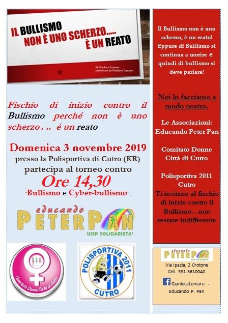 Organizzato dalle Associazioni Educando Peter Pan – Uisp Solidarietà di Crotone, Donne di Cutro e Polisportiva 2011 Cutro. <Di Bullismo se ne deve parlare quanto più possibile, a scuola, nei contesti giovanili e anche facendo sport> ne è convinto Gianluca Lumare, Presidente dell’Associazione Educando Peter Pan, che continua <solo facendo informazione e formazione si può maturare la piena consapevolezza che gli atti di bullismo sono dei reati e che di conseguenza le vittime hanno il diritto ad essere tutelate e non lasciate mai sole>. Il calcio, lo sport aggregativo per eccellenza, diventa per questa giornata il nostro strumento per veicolare il messaggio anti bullismo e cyber-bullismo sia ai ragazzi che agli adulti. Sarà una occasione per parlare di sani valori, di casi concreti di violenza, di valutare i pericoli e le insidie della rete internet, quindi parlare di educazione digitale. Sarà presente, in prima linea come sempre soprattutto accanto ai giovani, Padre Giovanni Aitollo, parroco di Cutro.