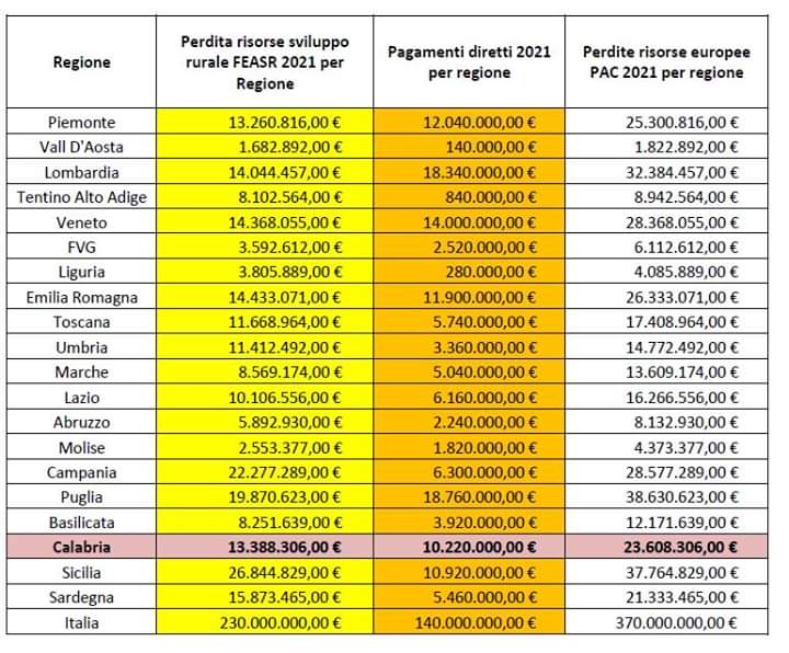 Preoccupa e non poco la proposta di regolamento transitorio adottato dalla Commissione europea che prevede un taglio di 370 milioni di euro all’agricoltura italiana per la Politica agricola comune (Pac) dal 2020 al 2021. Una agricoltura – afferma Coldiretti Calabria – che è diventata la più green d’Europa con primati nella qualità e nella sicurezza alimentare, valori e potenzialità che evidentemente non vogliono essere riconosciuti. Per l’Italia vengono stanziati 3,56 miliardi in pagamenti diretti e 1,27 per lo sviluppo rurale (Psr), rispettivamente quindi 140 milioni (-3,9%) e 230 milioni in meno (-15,6%) rispetto al massimale 2020, per una riduzione totale di 370 milioni di euro, prevista nel 2021 con il passaggio dal nuovo al vecchio Quadro Finanziario Pluriannuale (QFP). E quali saranno le conseguenze per la Calabria? Nel 2021 una perdita di risorse rispettivamente per il Psr di 13.388306,00 milioni di €uro e per i pagamenti diretti di 10.2220.00,00 milioni di €, l’ottava regione in Italia per taglio di risorse (vedi tabella allegata). “Un salasso – commenta Francesco Cosentini direttore di Coldiretti Calabria – che ne sette anni di programmazione 2021-2027 potrebbe superare i 160milioni di €uro. Con l’adozione dei regolamenti transitori la Commissione europea riconosce che, per il prolungarsi dello stallo sui negoziati paralleli sulla riforma e sul bilancio Ue 2021-2027, non ci sono i tempi per avviare la nuova Pac nel 2021 come previsto. Propone quindi una serie di aggiustamenti necessari a estendere l’attuale quadro legislativo e posticipare l’applicazione delle nuove regole di un anno, affinchè la nuova Pac possa entrare in vigore il 1 gennaio 2022”. È necessario garantire all’agricoltura le risorse necessarie per continuare a rappresentare un motore di sviluppo sostenibile per l’Italia e l’Europa – continua Coldiretti – nel sottolineare che indebolire l’agricoltura che è l’unico settore realmente integrato dell’Unione significa minare le fondamenta della stessa Ue in un momento particolarmente critico nel quale vanno fatte scelte decisive per il suo futuro. “Anche dall’ultimo rapporto SVIMEZ – afferma Franco Aceto presidente di Coldiretti Calabria – emerge in modo netto, che quando va in crisi l’agricoltura al Sud e in particolare in Calabria, le conseguenze ricadono sull’intera economia con indici negativi per il PIL e altri fattori economici. Un arretramento sul fronte delle risorse europee sulle quali poter contare avrà pesanti conseguenze nella nostra regione”. Il negoziato tra i Capi di Stato e di Governo è un appuntamento chiave è necessario pertanto sempre maggiore intransigenza – precisa Coldiretti – nelle prossime tappe per salvaguardare le risorse finanziare ma anche per realizzare una riforma della Politica Agricola Comune (PAC) che “riequilibri” la spesa facendo in modo di recuperare con forza anche il suo antico ruolo di sostegno ai redditi e all’occupazione agricola per salvaguardare un settore strategico per la sicurezza e la sovranità alimentare in un momento in cui il cibo è tornato strategico nelle relazioni internazionali dagli accordi di libero scambio all’embargo fino ai dazi
