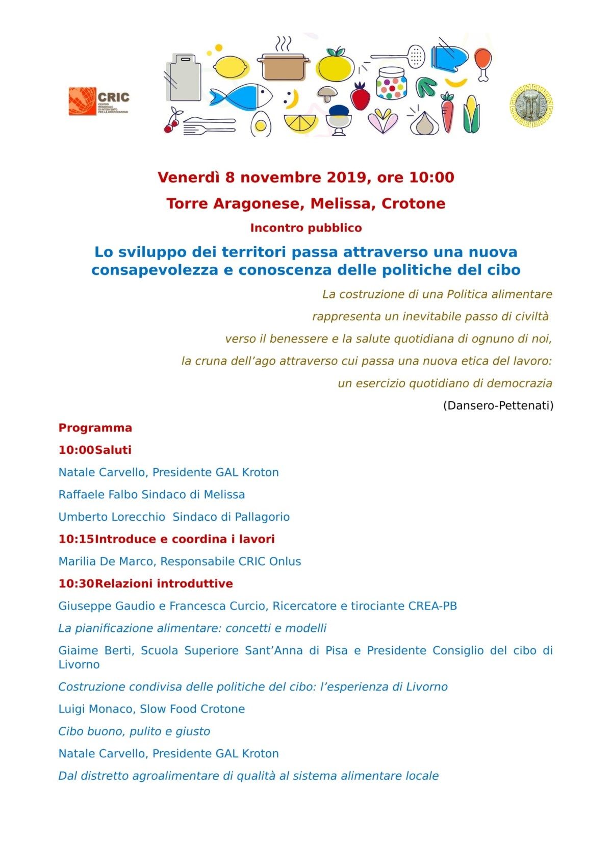 Oggi, venerdì 8 novembre presso la Torre Aragonese di Torre Melissa a partire dalle ore 10,00 si terrà un incontro dal titolo “Lo sviluppo dei territori passa attraverso una nuova consapevolezza e conoscenza delle politiche del cibo”. L’iniziativa è organizzata dall’Associazione CRIC onlus in collaborazione con il Gal Kroton ed il CREA. Per gli organizzatori il cibo è un elemento vitale e centrale nel sistema economico e produttivo, attorno al quale occorre progettare uno sviluppo integrato e sostenibile del territorio. Il cibo ha strette interconnessioni con le politiche pubbliche ed è una tematica trasversale che interessa e influenza l’economia locale, la sanità pubblica e la qualità delle zone urbane e rurali. Da ciò l’esigenza di progettare e realizzare un Piano del Cibo con l’obiettivo di creare un modello economico dinamico intorno al sistema alimentare, garantendo un reddito adeguato a tutti gli attori della filiera, ridurre gli sprechi alimentari lungo tutte le fasi della filiera, riconoscere il valore della sostenibilità del cibo, sviluppare le forme di filiera corta e la diversificazione aziendale, promuovere una gestione sostenibile delle risorse naturali e degli ecosistemi. All’iniziativa parteciperanno Ricercatori, Esperti del mondo agroalimentare e socio-economico, Docenti, Sociologi, Sindaci, Produttori Agricoli, Operatori Commerciali.