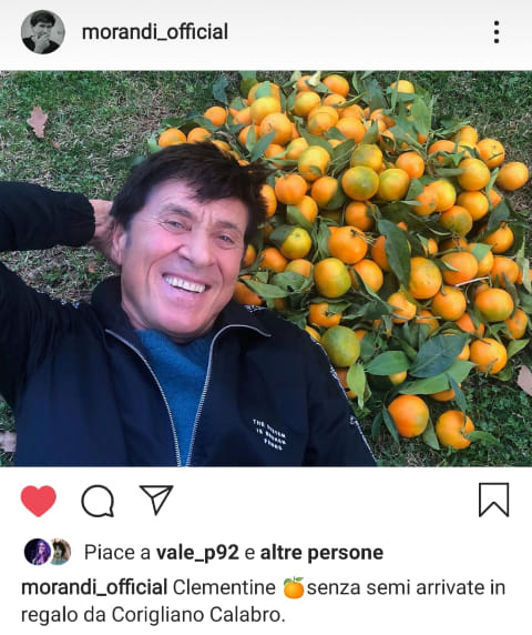 Gianni Morandi riceve le clementine di Corigliano Rossano inviate da Fabio Pistoia e le pubblica su Instagram