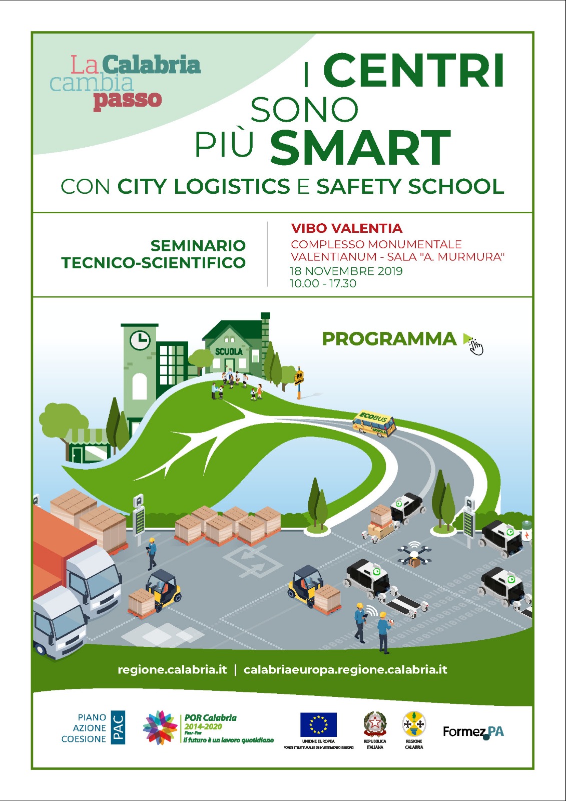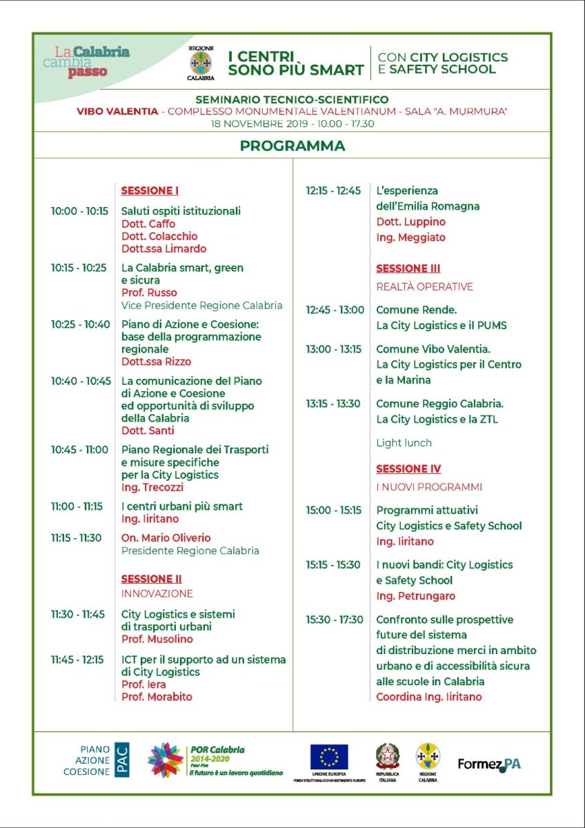 Nel corso della giornata verranno illustrate le attività messe in campo dalla Regione per City Logistics e Safety School; verranno illustrati i progetti di City Logistics delle città di Vibo, Reggio e Rende già finanziati e le procedure per il finanziamento di altri progetti con l’Avviso pubblico ad oggi aperto.