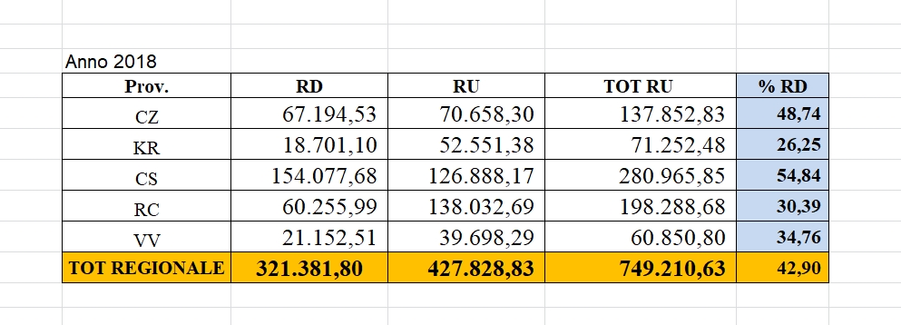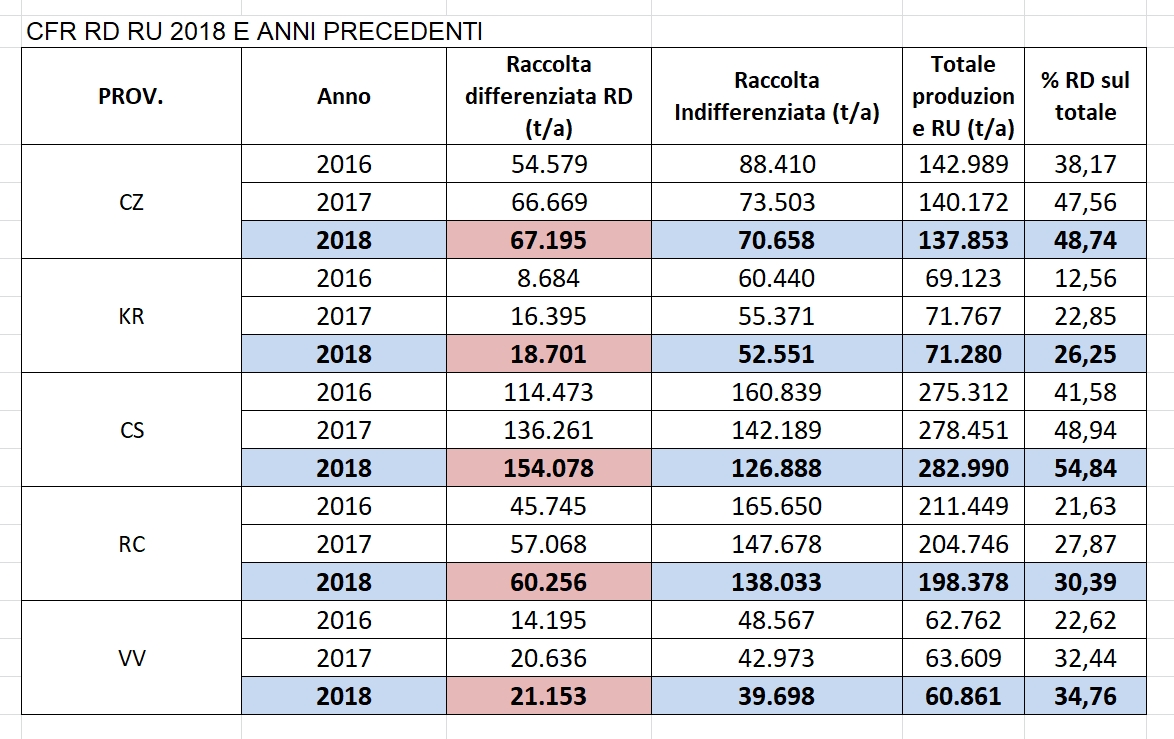 Nel complesso la Calabria continua nel suo trend di crescita costante, segnando rispetto al dato definitivo dell’annualità precedente un + 3,75 %, attestandosi al 42,90 % di differenziata sul totale di rifiuti annui prodotti sul territorio regionale, mentre a differenza del 2016 la Calabria è cresciuta di un + 11,70%.