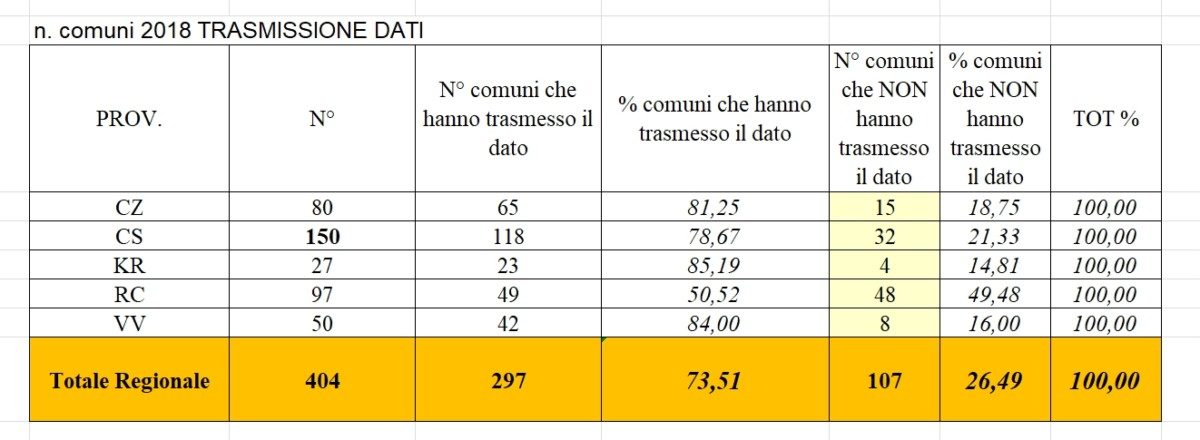 Nota dolente del report è la continua assenza di un quantitativo importante di comuni, che in provincia di Reggio Calabria sfiora addirittura il 50%, che non inviano i dati all’Arpacal, nonostante i diversi solleciti.  In provincia di Catanzaro 15 comuni su 80 non hanno inviato i dati, in provincia di Cosenza 32 su 150, in provincia di Vibo Valentia 8 su 50, nel Crotonese 4 su 27 e, appunto, in provincia di Reggio Calabria 48 comuni su 97 non hanno trasmesso le schede-dati all’Arpacal. Dal catasto regionale rifiuti, attraverso calcoli previsionali, fanno sapere che riuscendo a recuperare i dati dei comuni “assenti”  il dato regionale della differenziata potrebbe salire di circa 3 punti percentuali.