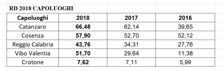 Provincia di Cosenza a parte, che fa da battistrada, l’andamento complessivo dei territori provinciali segna buone performance per Catanzaro (48,74%), ed una sostanziale crescita percentuale anche per Vibo Valentia (34,76%) e Reggio Calabria (30,39%) , con Crotone che continua a migliorare (26,25%).