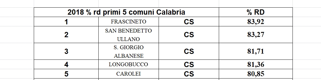 Analizzando i dati pubblicati sul report, la “hit parade” dei cinque comuni più sensibili in Calabria nella raccolta differenziata sono tutti in provincia di Cosenza: Frascineto (83,92%), San Benedetto Ullano (83,27%), San Giorgio Albanese (81,71%), Longobucco (81,36%) e Carolei (80,85%).