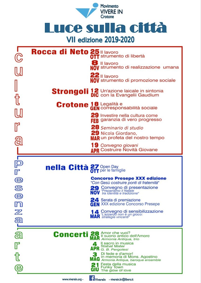 Di particolare importanza è la XXX edizione del Concorso Presepe, che è reso possibile grazie alla generosa partecipazione di tante famiglie e delle scuole. L’impegno nella campagna di sensibilizzazione sul gioco d’azzardo si avvale della collaborazione con l’IT.I.S. “G. Donegani” di Crotone e comprende l’esposizione di una mostra di vignette sul tema. Infine, gli eventi musicali, con una serie di quattro concerti, affidati come ogni anno alla direzione artistica del maestro Luca Campana che vedranno il culmine nel mese di giugno con la partecipazione alla Festa europea della musica.