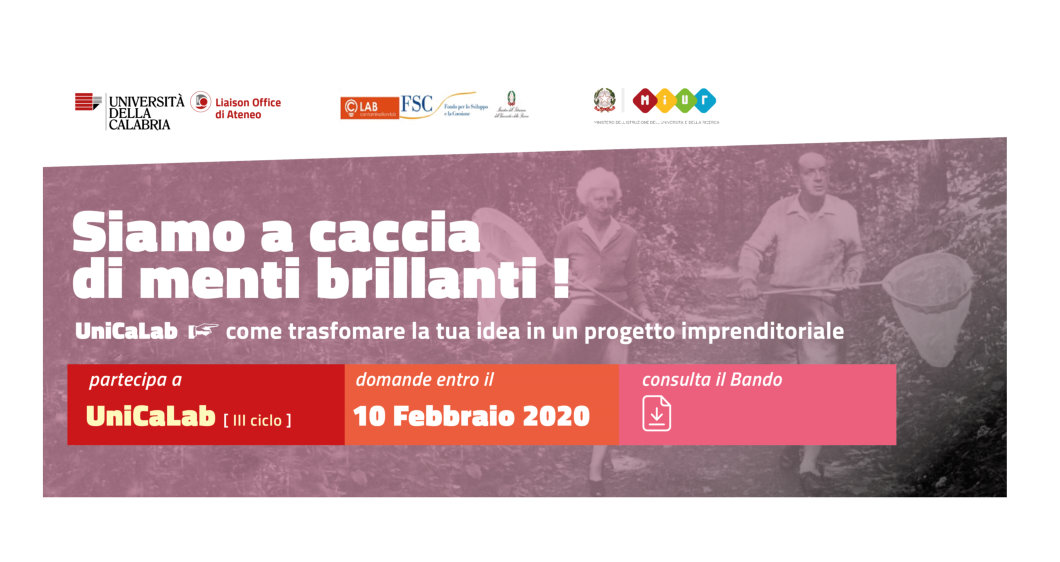 Dopo le precedenti edizioni che hanno riscosso tanto successo in termini di partecipazione e di ricadute, l’Università della Calabria ha lanciato il bando per la selezione dei partecipanti al III ciclo di UniCaLab, il percorso di formazione e contaminazione che mira a promuovere l’attitudine imprenditoriale attraverso la contaminazione dei talenti.