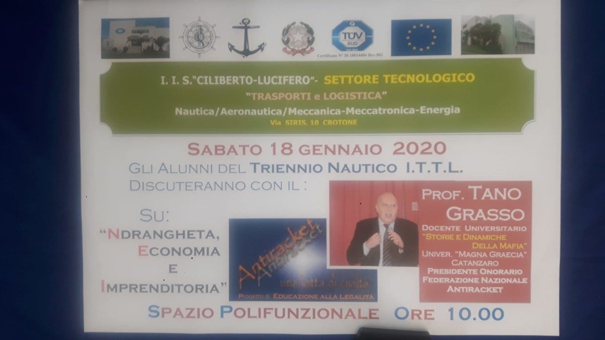 Magnetico, non si può descrivere diversamente Tano Grasso docente di Storia e dinamiche della mafia all’università Magna Grecia di Catanzaro nonché presidente della federazione nazionale antiracket. Sabato mattina con il suo carisma ha letteralmente catturato gli studenti che lo hanno tampinato anche nei dieci minuti di pausa, che tale alla fine non è stata, che avrebbe voluto fare durante la lezione che ha tenuto presso i locali dell’istituto Trasporti e logistica Mario Ciliberto di Crotone. I saluti sono stati portati dalla professoressa di Diritto Giuseppina Conci che con il suo impegno ha reso possibile l’evento, inoltre ha fatto le veci del dirigente Scolastico Girolamo Arcuri impegnato a Catanzaro, con una nutrita delegazione di studenti, alla manifestazione svoltasi a favore e sostegno del Procuratore antimafia Nicola Gratteri.