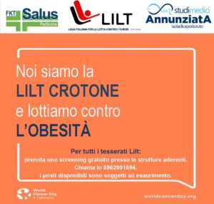 Il prossimo 4 febbraio, in occasione delWorld Cancer Day, il più grande evento globale dedicato alla prevenzione del tumore, la Lilt di Crotone, organizzerà una serie di iniziative, sul nostro territorio, per contrastare l’obesità. Nella giornata del 4 febbraio, nelle strutture convenzionate con la sezione di Crotone della Lega tumori, Fkt Salus Perticone, a Crotone, e Studi medici Annunziata, a Isola Capo Rizzuto, si terranno screening gratuiti su obesità. In particolare, presso la Salus, valutazione peso massa corporea a cura della nutrizionista Michela Zizza, e screening fisiatrico, a cura di Virginia Pace, direttore sanitario e fisiatra. Sempre il 4 febbraio, a Isola Capo Rizzuto, presso studi medici Annunziata, ci si potrà sottoporre a valutazione peso e sovrappeso con la nutrizionista Laura Nicotera.