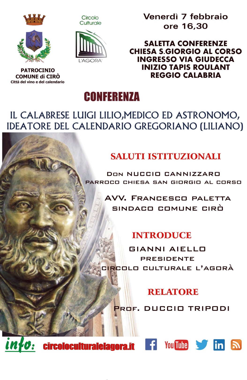 “Luigi Lilio, calabrese, medico ed astronomo: ideatore del calendario gregoriano”, sarà il tema del nuovo appuntamento, organizzato dal Circolo Culturale “L’Agorà” che avrà luogo venerdì 7 febbraio (ore 17,00) presso la saletta conferenze Chiesa San Giorgio al Corso (ingresso Via Giudecca – inizio tapis roulant) di Reggio Calabria. Parteciperà in qualità di relatore il prof. Leonardo Tripodi. La manifestazione, vista l’importanza del tema trattato dal Circolo Culturale “L’Agorà”, ha ricevuto il patrocinio morale del Comune di Cirò e per l’occasione sarà presente il Primo cittadino Avv. Francesco Paletta.